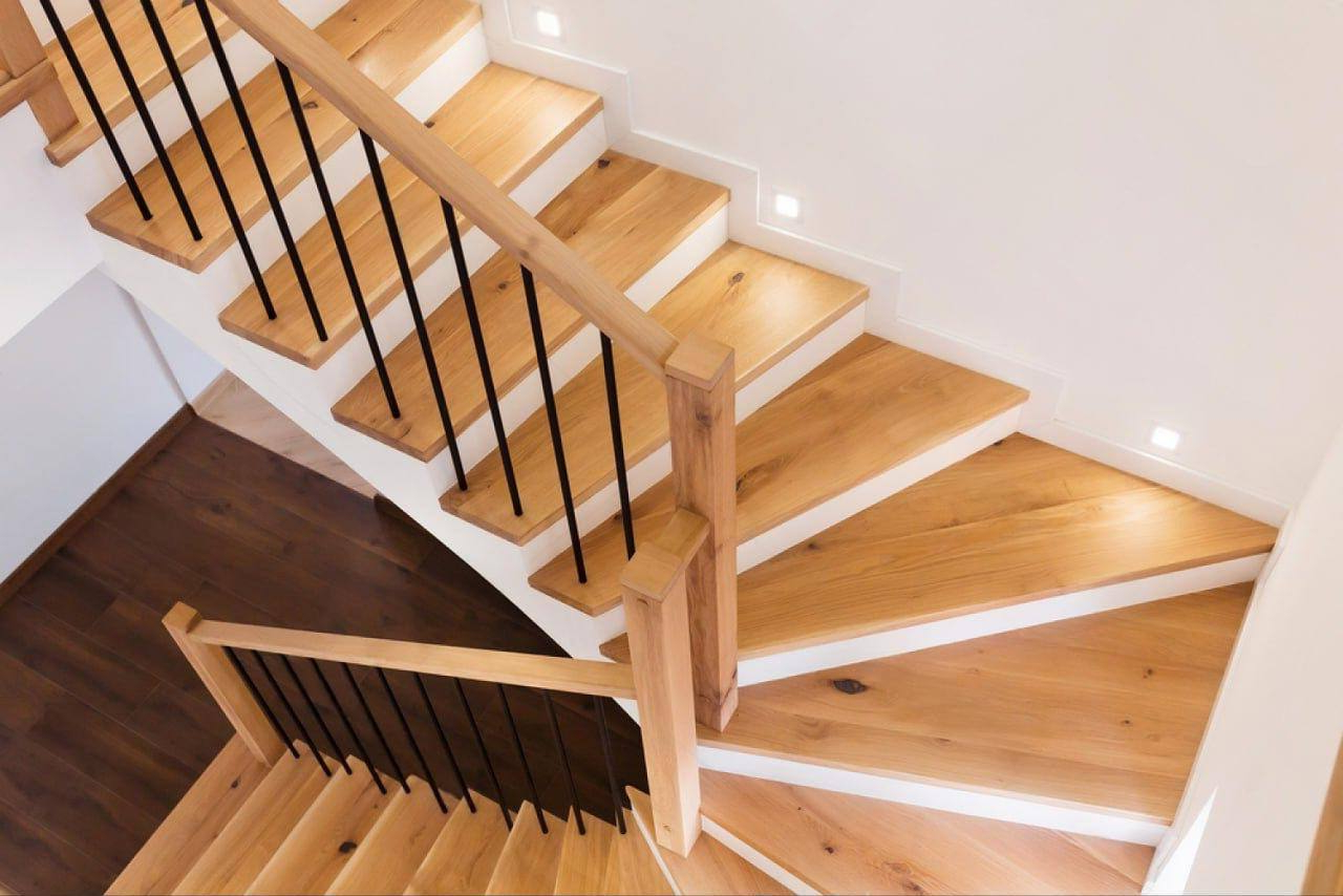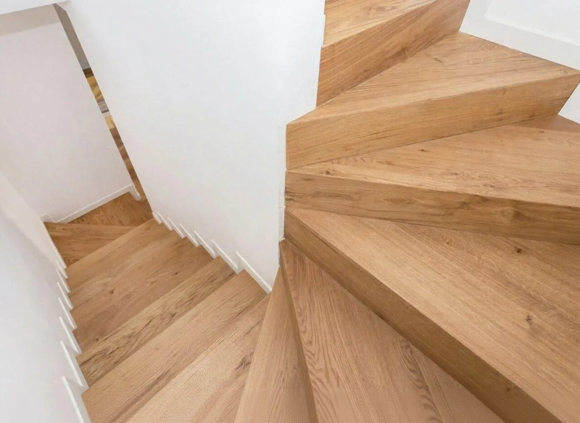 1. Профессионально выполним облицовку вашей Г-образной лестницы массивом дерева. Превратим сложный поворот в изящный и безопасный элемент интерьера, идеально подобрав материал и цвет.